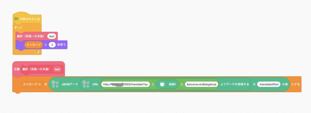 Stretch上では、拡張機能としてDataToolとImageClassifier2Scratchを追加して、以下のブロックを作成すると、カメラ上の認識したものを翻訳して、表示します。