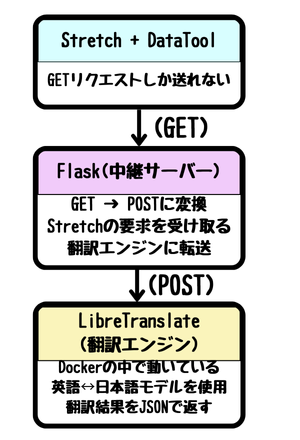 → DataToolのGETリクエストをPOSTリクエストにしてLibreTranslateに送る必要がある。